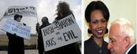 Activistas de izquierda protestan en Jerusal� poco antes de la llegada de la secretaria de Estado estadunidense Condoleezza Rice, y con pancartas exigen el fin de la ocupaci�e los territorios palestinos por Israel. A la derecha, la jefa de la diplomacia de Estados Unidos durante su encuentro con el primer ministro israel�riel Sharon FOTOS Afp
