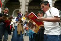 Dialogan, quieran o no, los que hormiguean aquí y allá; los que hojean un libro, los que asisten a una conferencia, los que piden un autógrafo, los que leen y los que escriben; dialogan los que vienen por obligación, porque los mandaron de la escuela. Lo hacen con más gusto los que vienen por su voluntad, aunque sea nada más a ver; también los que andan de paseo como quien va a Chapultepec, con un niño de la mano o en brazos. Dialogan los que ya saben qué quieren y los que llegan dispuestos a dejarse sorprender.