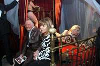 Jos�uis Cuevas y su esposa Beatriz Baz�durante la inauguraci�e la muestra del pintor en el recinto de Academia 13, Centro Hist�o. Al fondo, dos actrices realizaron movimientos sensuales junto a algunas de las obras FOTO Pedro S�hez/ Notimex