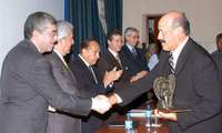 En la entrega de reconocimientos a los ganadores del noveno Premio Nacional de Seguridad e Higiene en el Trabajo, el director de Prestaciones M�cas del IMSS, Onofre Mu�Hern�ez (izquierda), dio a conocer que en los �os cuatro a�se redujeron los riesgos de trabajo de 3.7 a 2.9 por cada 100 trabajadores. A la izquierda del funcionario, el subsecretario del Trabajo, Fernando Flores, y el secretario general del Seguro Social, Juan Mois�Calleja Garc�