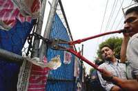 Empleados de la delegaci�ochimilco rompen la cadena de la entrada al predio ubicado en el Perif�co que era ocupado ilegalmente por una planta de gas que suministraba gas a microbuses de manera clandestina FOTO Jos�ntonio L�