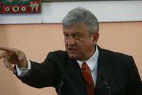 El jefe de Gobierno del Distrito Federal, Andr�Manuel L� Obrador, en la conferencia de prensa donde se quit� mo�ricolor que us� protesta por su posible inhabilitaci�or el caso El Encino FOTO Marco Pel�