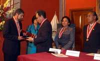 El rector Juan Ram�e la Fuente recibe de su hom�o Manuel Burga D� el diploma que lo distingue como doctor honoris causa por la Universidad Nacional Mayor de San Marcos, de Per�O Notimex