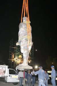 La estatua del emperador Ahuiz�fue retirada de su pedestal la madrugada de ayer, para su traslado al lugar donde ser�estaurada, junto con la de Izc� FOTO Notimex