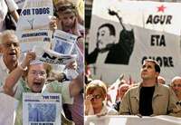 Madrid, 4 de junio. Dos manifestaciones antagónicas recorrieron hoy las calles de Madrid y Bilbao. La primera para expresar el rechazo a cualquier tipo de negociación con la organización armada vasca ETA, y la segunda en apoyo a la propuesta de paz impulsada por el ilegalizado partido Batasuna.