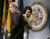 Durante la sesi�e la Asamblea General de la OEA, el presidente George W. Bush y la secretaria de Estado, Condoleezza Rice, en el centro de convenciones de Fort Lauderdale, Florida FOTO Reuters