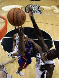 Chauncey Billups, de los Pistones (izquierda), intenta encestar, mientras Nazar Mohammed, de los Spurs, hace un esfuerzo por bloquear el bal�OTO Ap