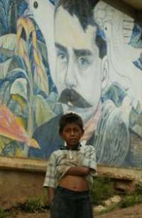 Un menor aguarda a sus padres frente a un mural del caracol de La Garrucha FOTO Jos�arlo Gonz�z