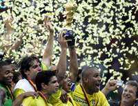 Ronaldinho encabeza la celebraci�e Brasil como campe�e la Copa Confederaciones 2005 FOTO Ap