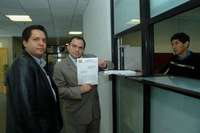 Oaxaca, Oax., 1º de julio. Trabajadores y voceadores del periódico Noticias realizaron un plantón frente a las oficinas de la Junta Local de Conciliación y Arbitraje (JLCA) de Oaxaca, como parte de la jornada de lucha nacional e internacional para denunciar el hostigamiento e intimidación que sufren por parte del gobierno estatal para cerrar su fuente de trabajo, cuyo propietario se ha confrontado con el gobernador Ulises Ruiz Ortiz.