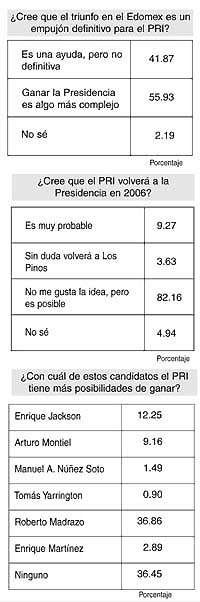 A UN AÑO DE distancia de las elecciones de julio de 2006, el eventual regreso del PRI a la Presidencia de la República es visto con preocupación y rechazo por un amplio sector de votantes. 82 por ciento de mil 4 personas que participaron en el sondeo de opinión que llevamos a cabo esta semana contestó "no me gusta la idea, pero es posible", a la pregunta: "¿crees que el PRI volverá a la Presidencia en 2006?" El 36 por ciento piensa que ninguno de los aspirantes priístas -Madrazo, Jackson, Montiel, Yarrington, Núñez Soto y Martínez- tiene posibilidades de ganar, sin embargo, otro 36 por ciento supone que Madrazo sí las tiene. En relación a la elección reciente en el estado de México, que, según algunos analistas, ha dado a los priístas un fuerte empujón para reconquistar Los Pinos, 41 por ciento opina que "es una ayuda, pero no definitiva", y casi 56 por ciento afirma que "ganar la Presidencia es algo más complejo".