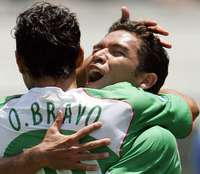 Bravo fue el primero en felicitar a Galindo, quien debut� el Tri con una diana FOTO Reuters