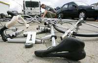 Expertos revisan la bicicleta averiada de Amy Gillet, quien se preparaba para la vuelta a Turingia FOTO Ap