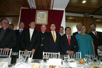 El representante del Vaticano en México, Giuseppe Bertello; el líder nacional del PRI, Roberto Madrazo; el cardenal Norberto Rivera Carrera; el obispo de Ecatepec, Onésimo Cepeda; el gobernador electo mexiquense, Enrique Peña Nieto; el mandatario de Puebla, Mario Marín; el presidente de Convergencia, Dante Delgado; la titular de la Fundación Colosio, Beatriz Paredes, y el director del IMSS, Santiago Levy, durante el festejo que organizó el prelado ecatepequense, también empresario taurino, por sus 10 años en la diócesis FOTO Francisco Olvera