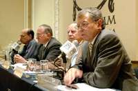 Angel Guerra, Gustavo Iruegas, el ex embajador Oscar Gonz�z y el diputado federal Manuel Camacho Sol� en la Casa Lamm, durante el foro La pol�ca exterior mexicana en lo que va del sexenio FOTO Guillermo Sologuren