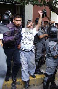 Integrantes de la Alianza Binacional Braceroproa, organización que exige al gobierno federal la entrega de ahorros que ex migrantes acumularon entre 1942 y 1964, ingresaron por la fuerza al inmueble. Diez de ellos fueron detenidos. "Sólo nos dan atole con el dedo"; "Fox, no detengas el dinero que no es tuyo!", gritaban FOTO Javier Lira/ Notimex
