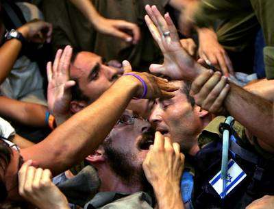 Las fuerzas de seguridad israelíes desalojaron ayer 16 de los 21 asentamientos judíos en el territorio palestino, entre ellos los emblemáticos Neve Dekalim y Kafr Daron, luego de enfrentamientos con opositores que se refugiaron en sinagogas (en la imagen). Durante la operación 44 personas resultaron heridas y 160 fueron detenidas FOTO Reuters