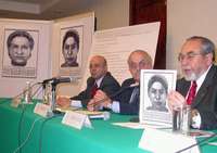El titular de la PGJDF, Bernardo B�z, muestra el retrato de uno de los presuntos homicidas de personas de la tercera edad, durante la conferencia de prensa que ofreci�nto con el subprocurador Renato Sales y Pedro Borda, al centro, director del Inapam FOTO Agust�Salgado