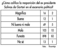 EN LAS ULTIMAS SEMANAS el ex presidente Carlos Salinas de Gortari -exiliado la mayor parte del sexenio del ex presidente Zedillo y principios del actual- ha hecho un segundo debut en el escenario de la política mexicana. Las respuestas de 82 por ciento de un grupo de mil 93 encuestados indican que su retorno es funesto, 9 por ciento opina simplemente que es malo. Se registraron muy pocos votos en el sentido de que es bueno o magnífico.