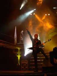 Metal gods y Riding the wing... Halford sabe que ya tiene al público en un puño. Sube las escaleras que conforman el escenario. Se para en las esquinas frente al público. Su voz alcanza alturas de ultratumba. Los ecos reverberan. Touch of evil, Judas rising, hasta la pesadísima Revolution.