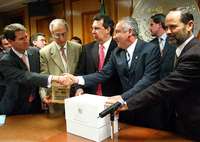 El presidente de la C�ra de Diputados, Heliodoro D�, recibe el paquete presupuestal de manos del procurador fiscal, Luis Felipe Mancera FOTO Marco Pel�