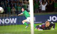 David Healy (izquierda) corre a festejar el gol que le dio el triunfo a Irlanda del Norte, ante el azorado portero Robinson FOTO Ap