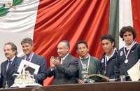 El t�ico Jes�m�z, el diputado Heliodoro D� e integrantes de la Sub-17 durante la ceremonia de premiaci�OTO Notimex