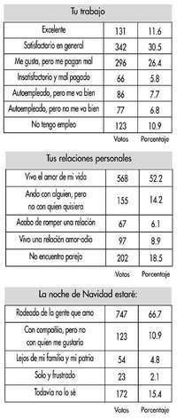 AUNQUE DON VICENTE y Felipillo no acaten la tregua decretada por el IFE, nosotros -¿es mucho candor?- dejaremos a un lado los temas políticos. ¿Cómo les pinta la Navidad? Según los expertos, la felicidad descansa en buena medida sobre dos pilares: una relación personal y un trabajo satisfactorios. De las mil 221 personas que encuestamos esta semana más de la mitad dijeron que viven el amor de su vida. Sin embargo, 18 por ciento no encuentra pareja y 15 por ciento "anda con alguien", mas no con quien quisiera. En el campo del trabajo, 11 por ciento es muy afortunado: hace lo que le gusta y le pagan bien. No obstante, 11 por ciento carece de empleo, 7 por ciento está autoempleado y no le va como quisiera y 30 por ciento encuentra que su situación laboral es satisfactoria, en general.