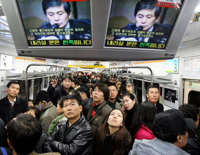 Pasajeros del Metro coreano observan la conferencia de prensa del cient�co Hwang Woo-suk, cuando acept� falsedad de su investigaci�OTO Ap