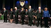 George W. y Laura Bush; Bill y Hillary Clinton; George Bush padre, junto a Jimmy y Rosalynn Carter, oran durante la misa por el sepelio de Coretta Scott, viuda de Martin Luther King