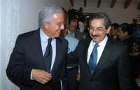 El director general del IMSS, Fernando Flores (izquierda), en Monterrey, con el gobernador José Natividad González Parás, al término de la reunión en la que aquél señaló que, para mejorar los servicios, se están haciendo erogaciones sin precedente a fin de concluir las obras en marcha. Anunció además inversiones por más de 700 millones en Nuevo León