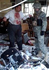 El dueño de un restaurante destruido por un atacante suicida habla con un soldado estadunidense en Mosul. En el atentado murieron cinco personas y 21 resultaron heridas, 10 eran policías iraquíes