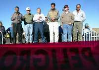 El secretario del Trabajo, Francisco Salazar, acompañado del gobernador de Coahuila, Humberto Moreira, y el presidente del Grupo México, Javier García de Quijano, anuncian el cierre de la mina, así como la suspensión del rescate de los 65 mineros, ayer