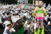 Puebla, Pue., 26 de febrero. Los primeros miles que arribaron al zócalo, y lo colmaron, iniciaron un minuto de silencio en memoria de los mineros fallecidos en Coahuila, pero no hubo más de 10 segundos sin sonido, porque comenzó a escucharse, primero como murmullo y luego retumbando, la voz del enorme contingente que seguía avanzando hacia la plaza, sin saber lo que ahí pasaba: ''¡Fuera Marín, fuera Marín!'', clamaban, estremeciendo a quienes los escuchaban. Las reproducciones de las caricaturas de La Jornada eran los íconos favoritos, incluso construyeron una piñata con uno de los marines dibujados por Helguera, con una botella en cada mano y medias caladas.