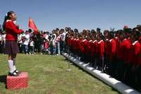 Niños indígenas cantan el Himno Nacional durante el acto que encabezó el delegado Zero en el balneario Tephé, en el municipio de Ixmiquilpan, Hidalgo