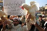 Comerciantes de aves de corral en Peshawar sostienen un cartel que dice: ''no hay evidencias de la gripe aviar en Pakistán''. En esa nación fueron sacrificados 25 mil pollos luego de que se detectaron dos casos de esa enfermedad