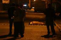 Integrantes de la Agencia Estatal de Investigaciones de Chihuahua observan el cadáver de un hombre que fue arrastrado desde un vehículo en movimiento, le cortaron el rostro y recibió el tiro de gracia. Según versiones policiacas, la víctima está relacionada con el caso de las narcofosas de las Acequias ocurrido en enero de 2003, cuando en una casa fueron encontrados sepultados 12 cadáveres