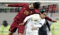 M. Aljaber Sami, de Arabia Saud� (derecha), es avasallado por el portugu�s Fernando Meira en la disputa por el bal�n FOTO Ap