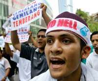 Malaysian shout slogan, "The government is cruel, long live the people", as they protest against the recent oil price hike in Kuala Lumpur, Malaysia, Friday, March 3, 2006. Several hundred people staged a peaceful demonstration Friday at Malaysia's tallest towers to protest the government's move this week to sharply raise retail gasoline prices. (AP Photo/Andy Wong)