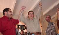 Martí Batres, presidente del PRD-DF, y José Narro, dirigente del PT, alzan los brazos a Marcelo Ebrard durante la toma de protesta de éste como candidato petista al GDF