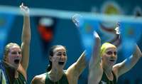 Las australianas Leisel Jones, Sophie Edington y Jessicah Schipper, tres de las integrantes del relevo femenil 4x100 combinado, festejan el récord impuesto en los Juegos de la Commenwealth
