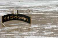 El letrero de un restaurante en Wehlen, Alemania, en el que se lee "Hasta luego" está a punto de ser cubierto por las aguas del río Elba, durante las inundaciones de la semana pasada