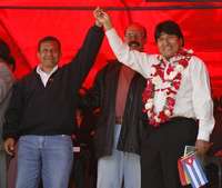 En la ciudad de Copacabana, donde se reunió con el candidato a la presidencia peruana, Ollanta Humala, durante la inauguración de un consultorio oftalmológico instalado con apoyo de Cuba y Venezuela, en el que prestan servicios médicos voluntarios cubanos y galenos bolivianos, el mandatario elogió la colaboración que "pese al bloqueo" está prestando al país el presidente cubano Fidel Castro, y criticó las numerosas condicionantes "16 requisitos, entre ellos erradicar la hoja de coca", que, dijo, impone Estados Unidos para otorgar su cooperación.