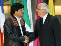 Saludo entre el presidente de Bolivia, Evo Morales, y el líder del Parlamento Europeo, Josep Borrel, en Estrasburgo, ayer