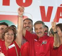 El candidato de la Alianza por México a la Presidencia de la República, Roberto Madrazo Pintado, y la señora Rosa Alicia Alvarez Piñones, madre del futbolista del Barcelona de España, Ra-fael Márquez, corresponden a los vítores que miles de priístas lanzaron ayer en La Piedad, durante una intensa gira proselitista realizada por Michoacán