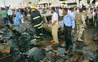 Policías y servicios de emergencia iraquíes remueven escombros del coche bomba utilizado en el atentado suicida de ayer en un concurrido mercado de la ciudad petrolera de Basora, dejando 28 muertos y 62 heridos
