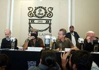 Luis de Tavira, el subcomandante Marcos, Otto Minera y Hugo Gutiérrez Vega durante el foro en el que se recordó a Bertolt Brecht, a medio siglo de su muerte