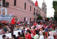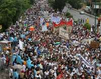Oaxaca, Oax., 16 de junio. En una nueva demostración de fuerza y para exigir la dimisión del gobernador del estado, Ulises Ruiz Ortiz -que se ha convertido en la principal demanda del magisterio, que negocia con el gobierno federal la rezonificación-, la sección 22 del Sindicato Nacional de Trabajadores de la Educación (SNTE) convocó a miles de profesores, ciudadanos, estudiantes universitarios e integrantes de organizaciones sociales y sindicales, quienes durante seis horas de caminata expresaron su repudio al desalojo violento de maestros, la madrugada del pasado miércoles.