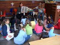 Entrada a la megabiblioteca y sala de consulta digital (arriba); sobre esta línea, sesión de uno de los talleres de verano en la sala infantil