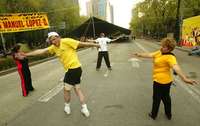 Un grupo de personas del plantón permanente en Paseo de la Reforma hacen sus ejercicios cotidianos sobre la avenida